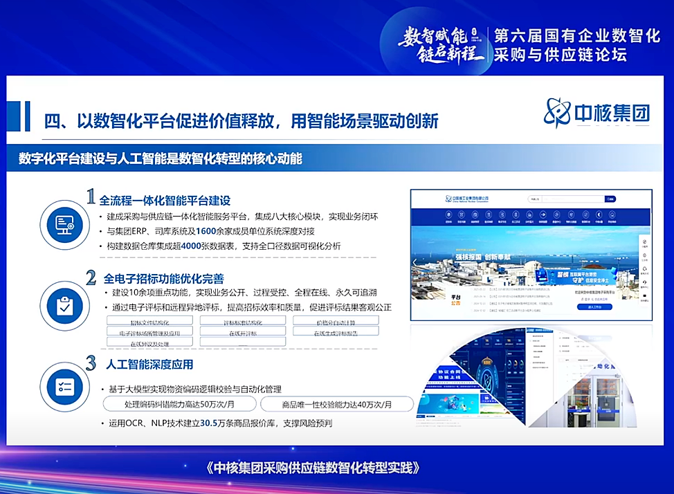 中國核工業(yè)集團有限公司經(jīng)營管理部副主任劉萍進行了《系統(tǒng)性變革推動采購供應(yīng)鏈升級,助力核工業(yè)高質(zhì)量發(fā)展》主題分享。劉萍指出,核工業(yè)是國家安全的戰(zhàn)略基石,中核集團以“自主可控、數(shù)智賦能”為目標,構(gòu)建了一體化智能管理體系,通過數(shù)字化技術(shù)提升采購決策的科學(xué)性和精準性,優(yōu)化供應(yīng)鏈資源配置,實現(xiàn)了采購供應(yīng)鏈的高效運作和風(fēng)險管控,為核工業(yè)的高質(zhì)量發(fā)展筑牢基礎(chǔ)。